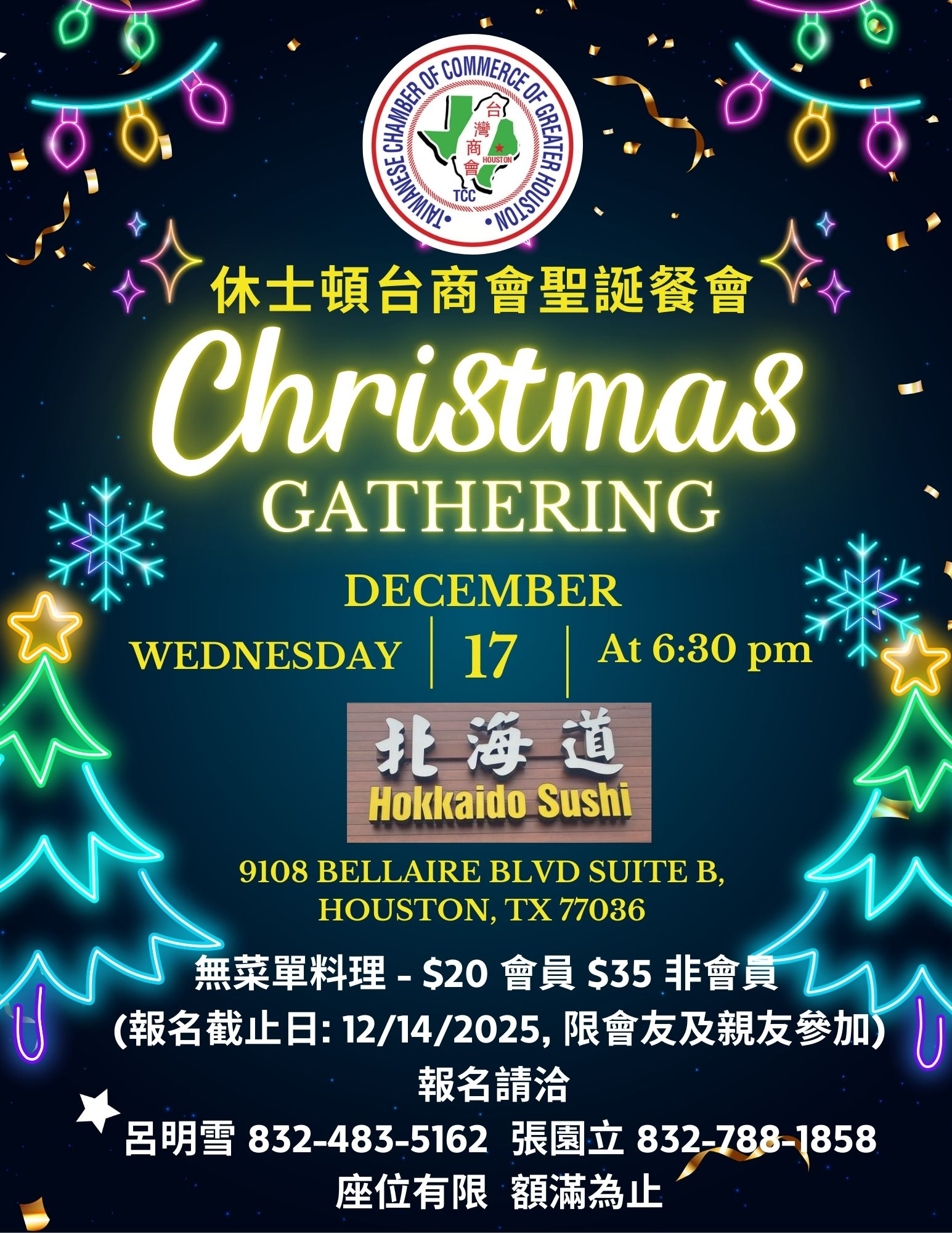 費用:無菜單料理 – $20 會員 $35 非會員 (報名截止日: 12/14/2025 或額滿為止 , 限會友及親友參加)
